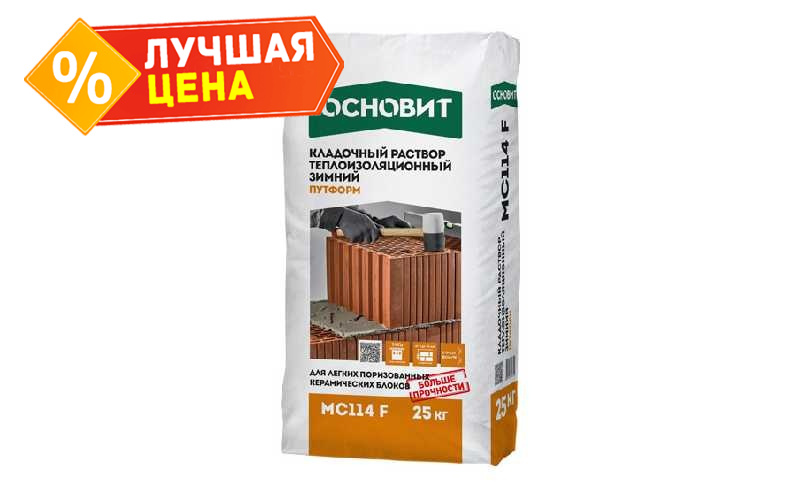 Теплоизоляционный кладочный раствор ОСНОВИТ ПУТФОРМ МС114 F зимний предназначен для кладки стен из лёгких пустотелых керамических блоков, блоков из бетона на пористых заполнителях при температуре окружающей среды и основания от -10 до + 10°С.